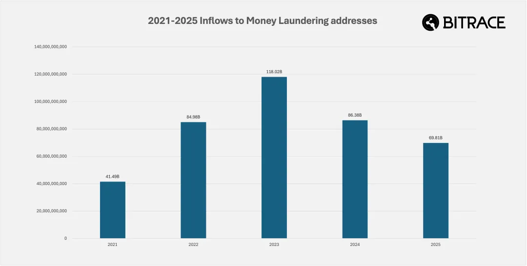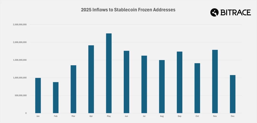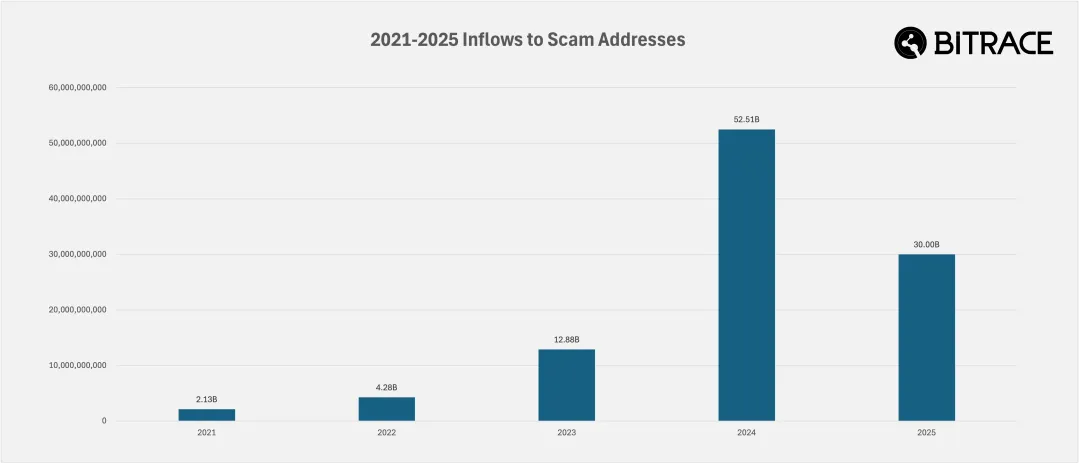 2025 年,Bitrace 追踪的涉及真实欺诈案件、稳定币冻结以及地址投毒等活动的相关地址所关联的资金规模达 300 亿美元,同比 2024 年显著下降。