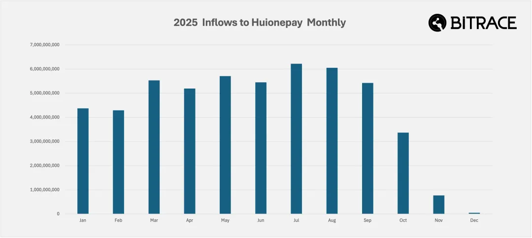 由于英美联合对柬埔寨太子集团与汇旺集团宣布了制裁,汇旺集团不得不暂时停止了旗下主要产业——汇旺支付(Huionepay)的经营。根据 Bitrace 的统计,汇旺支付在当年共收取 524 亿 USDT,但 12 月已经几乎停止了链上活动。