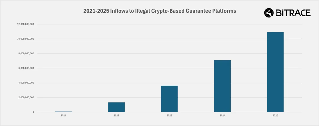 尽管黑灰产市场整体规模相比上年有所下降,但基于加密货币的非法交易担保平台在各国执法部门强力打击之下仍保持增长。根据 Bitrace 的统计,2025 年各非法交易担保平台的押金地址共收取 109 亿 USDT。