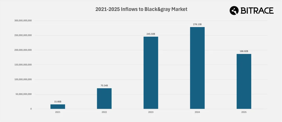 随着加密资产与链上协议的广泛应用,其在部分非法及高风险活动中的被滥用风险逐步显现。相关基础设施在网络赌博、洗钱、黑灰产交易、欺诈及规避制裁等场景中,主要承担价值转移、资金混合及非法资产存储等功能,这一趋势正受到监管机构的持续关注。根据 Bitrace 的监测与统计,2025 年全网被标记为高风险的区块链地址所收取的非法资金已经达到 5021 亿美元。