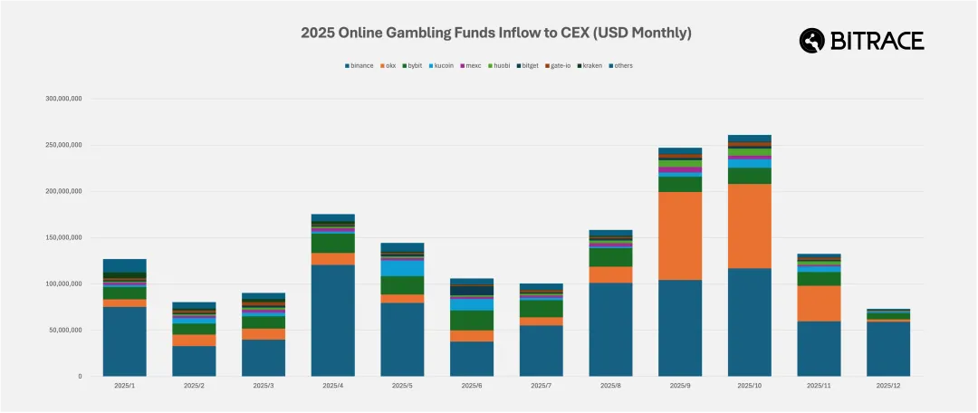 针对传统网络赌博平台的地址资金转出对手方进行统计,在 2025 年至少有 17 亿美元的 USDT 或 USDC 直接流入交易所用户地址,其中 82.40% 进入 Binance、OKX、Bybit 三家交易平台。