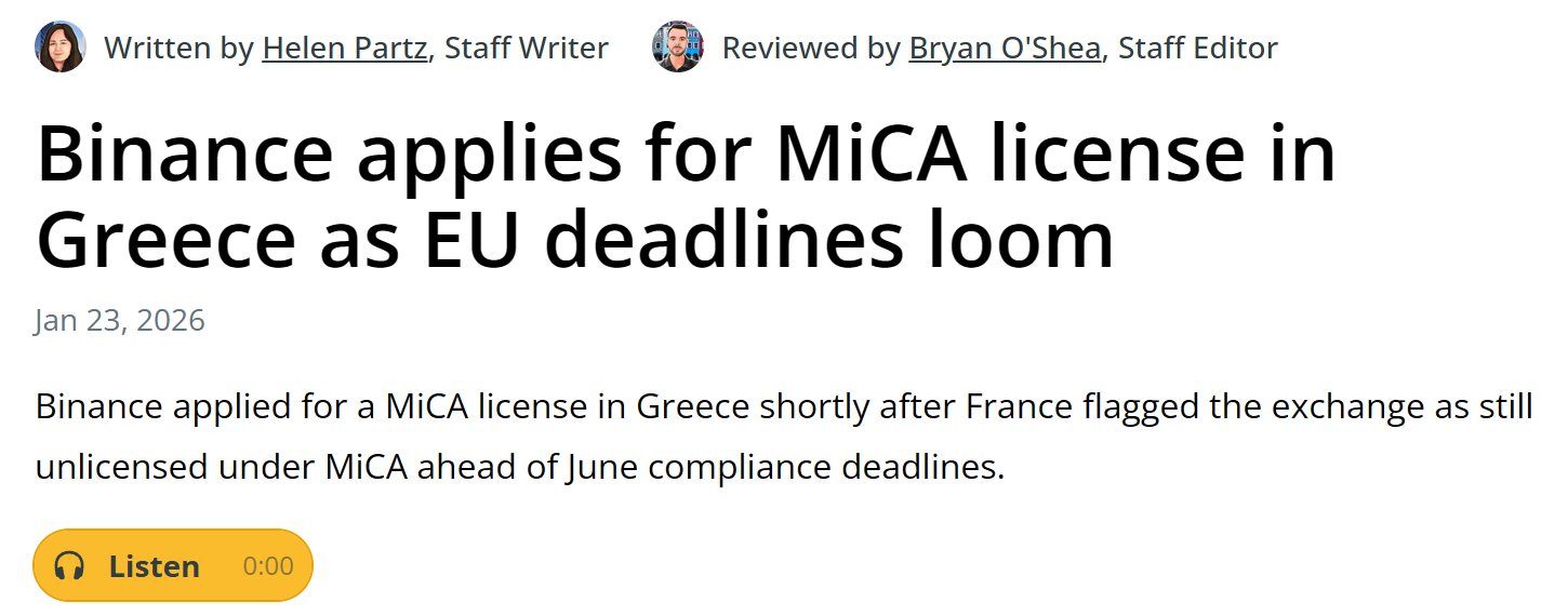 - 币安已向希腊申请 MiCA 牌照
