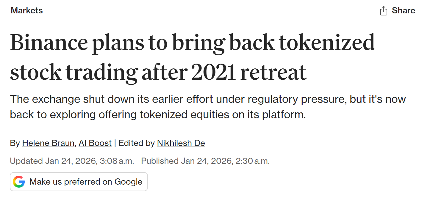 - 币安考虑重启股票代币化交易