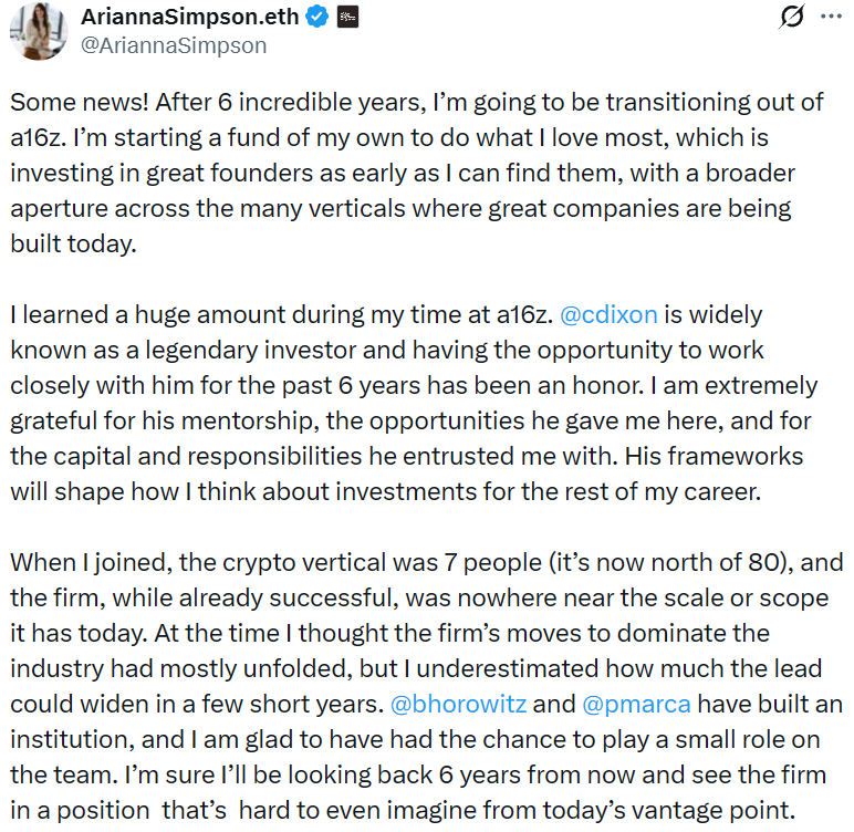 - a16z Crypto 普通合伙人 Arianna Simpson 离职
