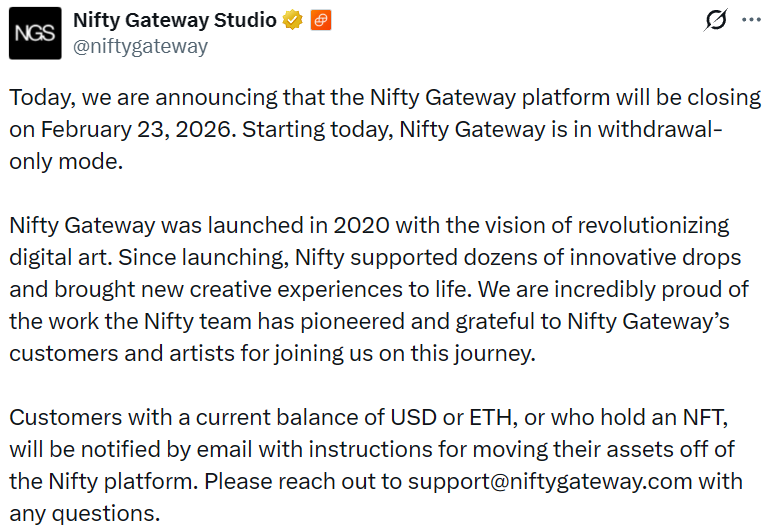 - NFT 交易平台 Nifty Gateway 将于 2 月 23 日关闭