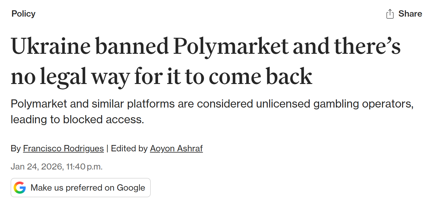 - 乌克兰已封禁 Polymarket