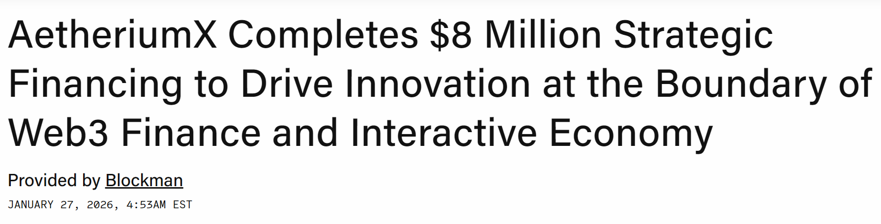 - Web3 生态系统 AetheriumX 完成 800 万美元融资,CGV 等参投
