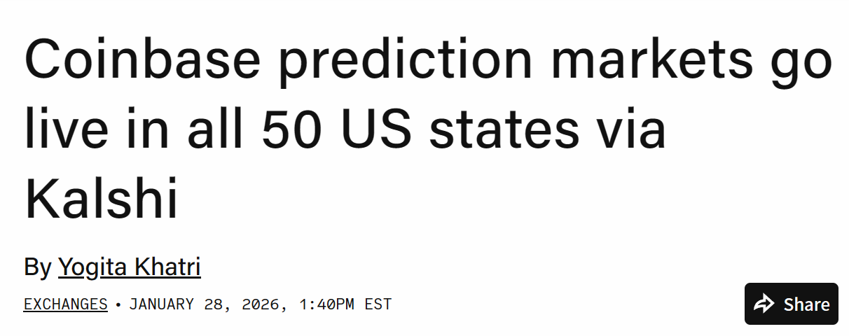 - Coinbase 预测市场通过 Kalshi 扩展至全美 50 个州