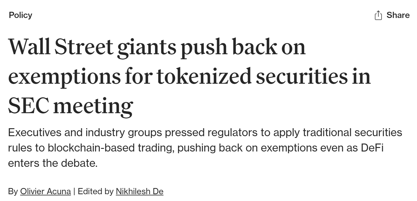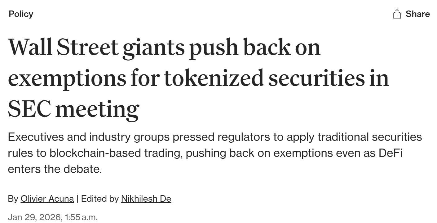- 摩根大通等五家华尔街巨头反对为代币化证券设立监管豁免
