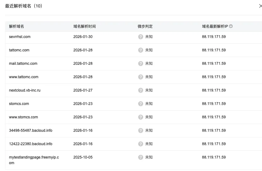 从威胁情报平台查询显示,该域名 sevrrhst[.]com 注册于 2026 年 1 月 23 日,使用低成本的免费证书,具有典型的 “快速抛弃” 特征。 其解析关联到 IP 地址为 “88.119.171.59”。