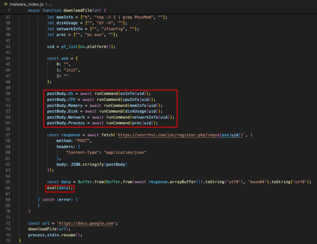 index.js 收集系统版本、CPU、磁盘、网络与进程等信息并上报;服务端据此下发新的脚本代码,由样本通过 eval 动态执行,从而具备持续扩展能力。