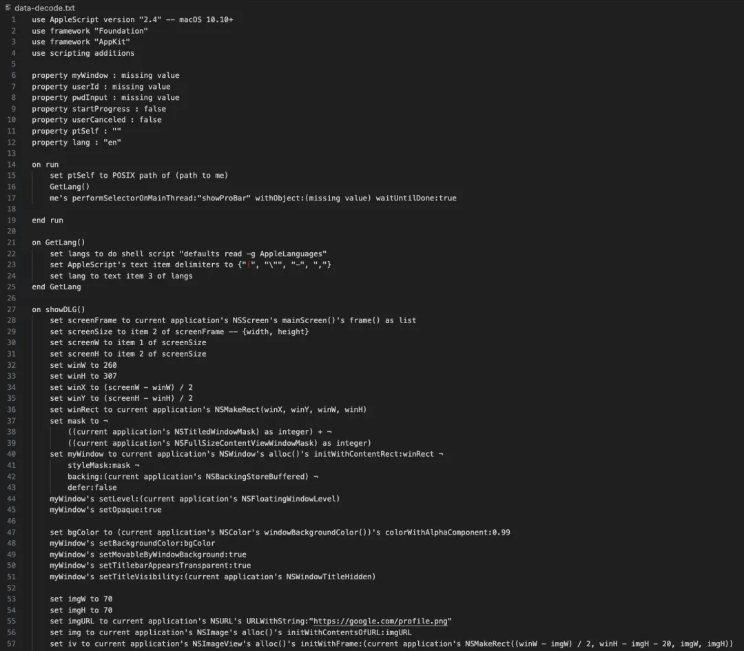 对脚本内容解码后发现,第一阶段(初始)AppleScript 主要用于下发后续恶意代码。
