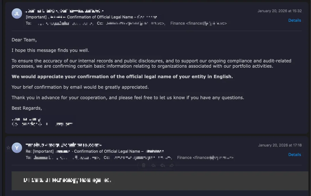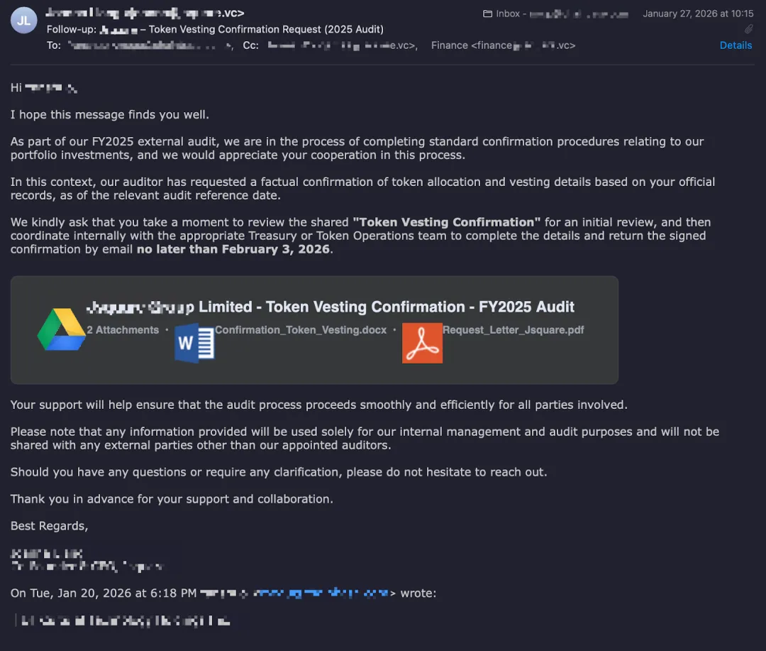 攻击者先以 “确认公司英文法定名称” 诱导收件人回复,随后以 “FY2025 外部审计”、“Token Vesting Confirmation 截止回传” 等话术持续跟进,并投递恶意的 Word/PDF 附件。通过社会工程诱导受害者打开附件并按提示操作,从而窃取凭据或敏感数据。