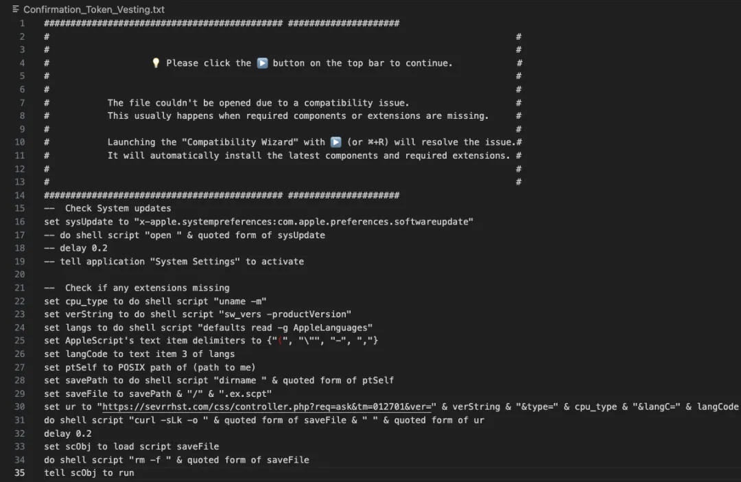 从样本文件特征来看,邮件附件名为 “Confirmation_Token_Vesting.docx.scpt”,实际为 AppleScript 脚本 (.scpt),通过双扩展名伪装为 docx 文档。