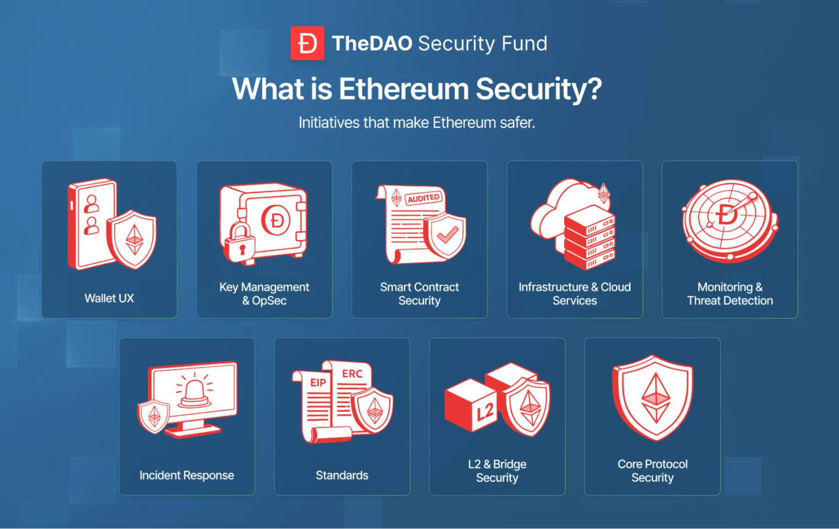 在资助范围上,TheDAO 安全基金的核心目标十分明确 —— 以以太坊全生态安全为首要任务,覆盖安全建设的全维度场景:从钱包用户体验优化、智能合约安全审计,到安全事件应急响应、以太坊核心协议安全升级,再到二层网络、跨链桥生态的安全防护,所有助力以太坊提升安全水平的工作,均纳入基金资助范畴。