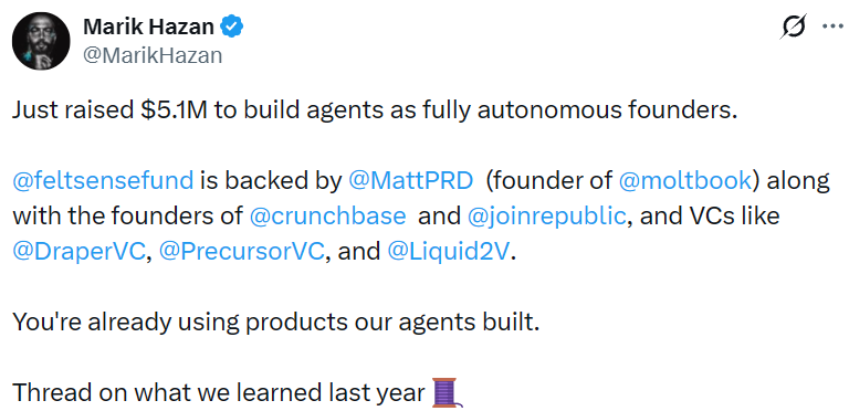 - 创始人 AI 代理构建项目 Feltsense 完成 510 万美元融资