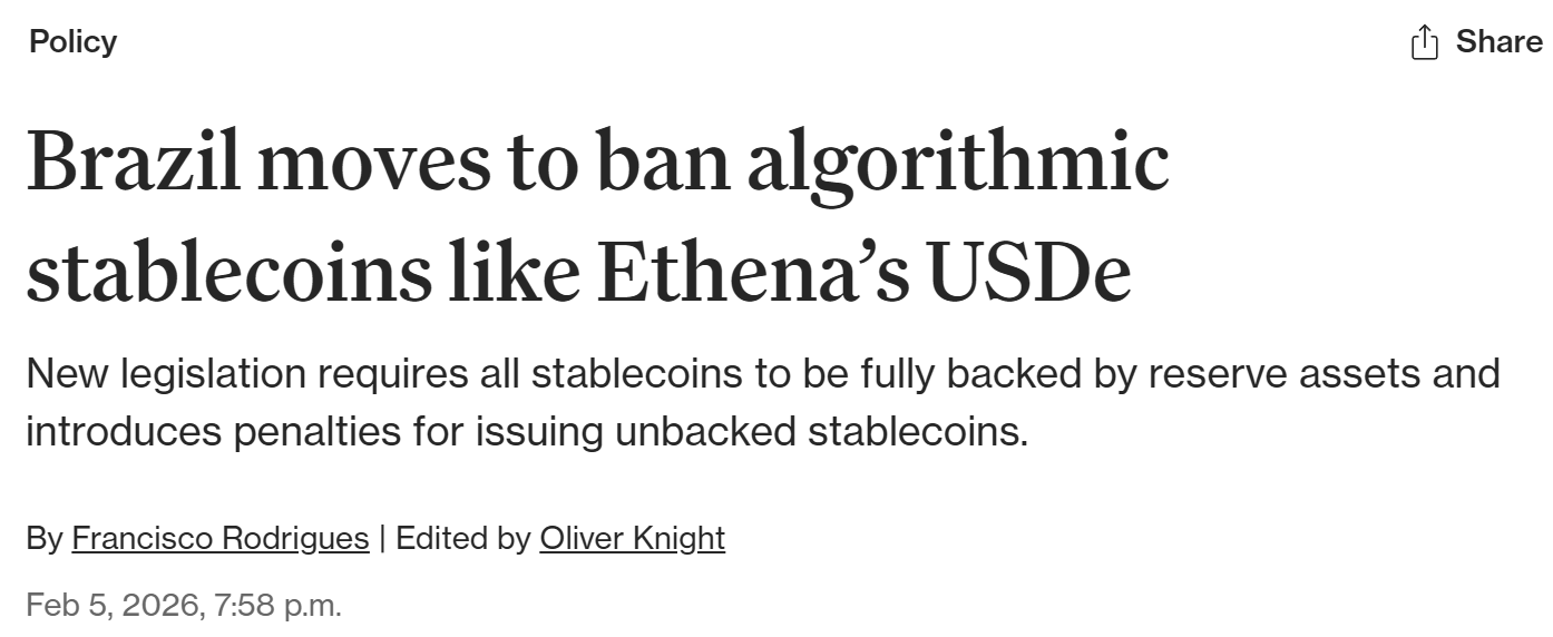 - 巴西禁止 Ethena 的 USDe 等算法稳定币的法案获委员会通过