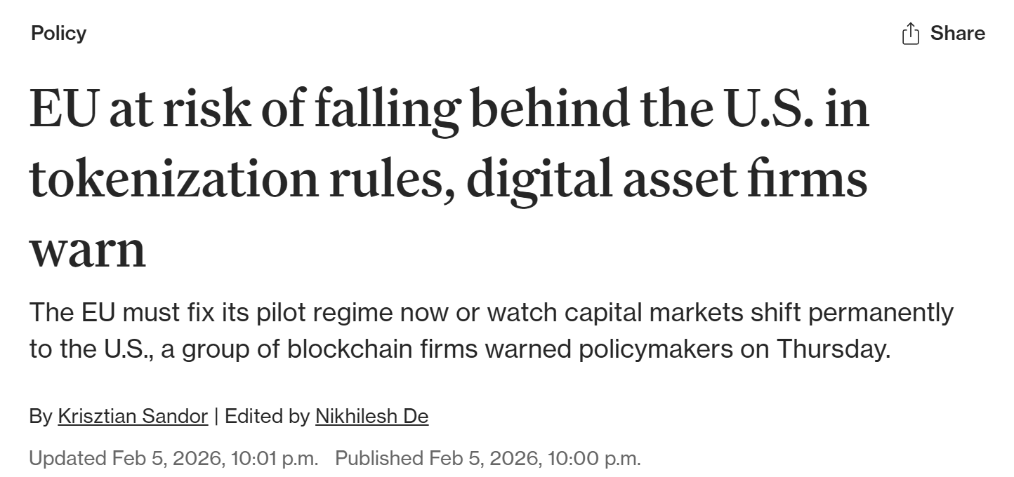 - Securitize 等八家受欧盟监管公司警告欧盟在代币化规则方面或将落后于美国