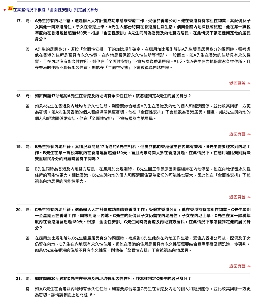 此次 FAQ 更新的重要意义,在于使用更贴近现实的案例(Q17-Q21),展示 “人才计划”“双城生活” 等常见情景下应如何依据加比规则判定个人税务居民归属。