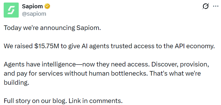 - AI 代理基础设施公司 Sapiom 完成 1575 万美元融资,Accel 领投