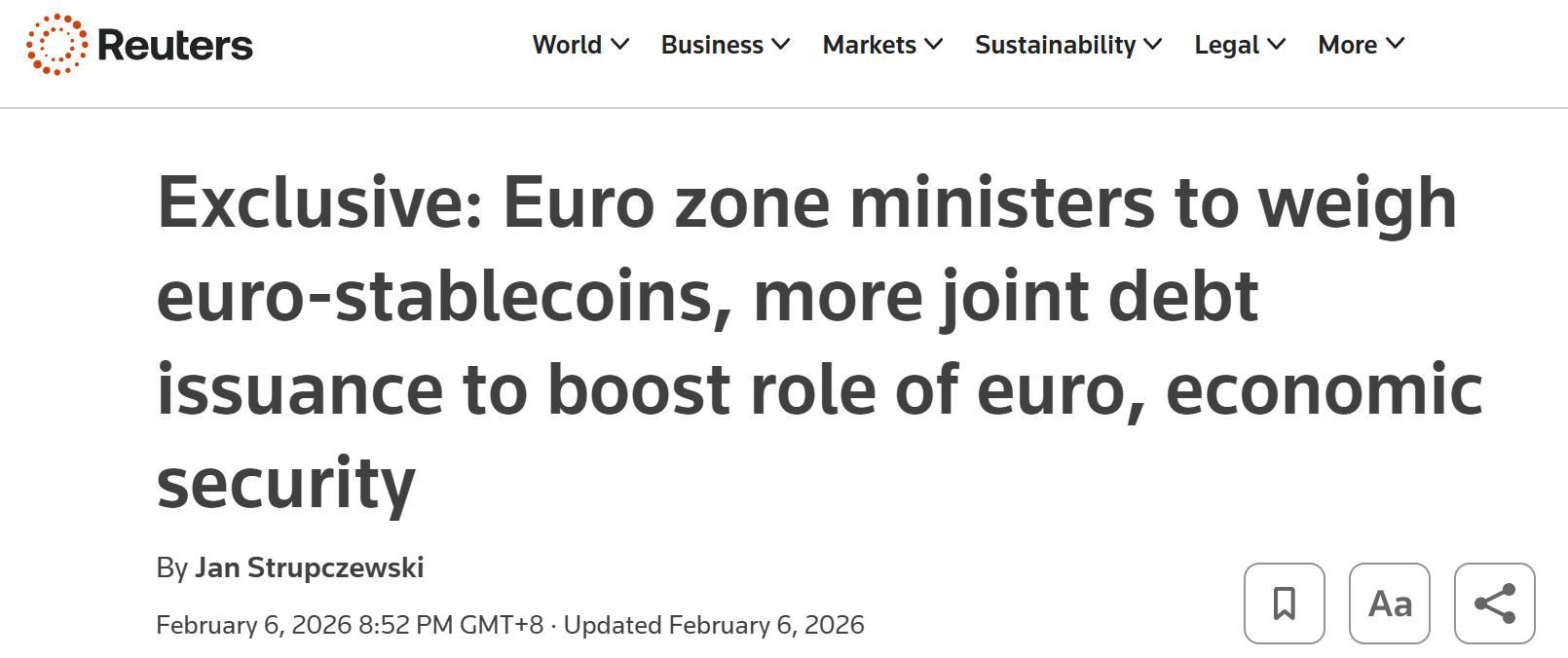 - 欧元区财长拟讨论发行欧元稳定币及联合债务