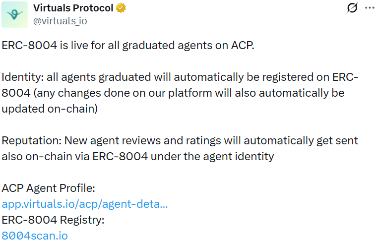 - Virtuals Protocol:ACP 上所有已毕业代理将自动在 ERC-8004 上注册