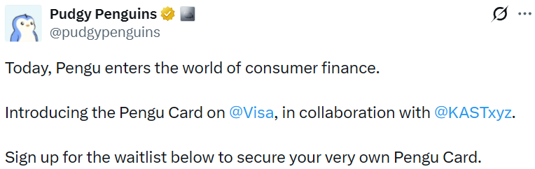 - Pudgy Penguins 将与 KAST 合作推出 Pengu Visa 卡
