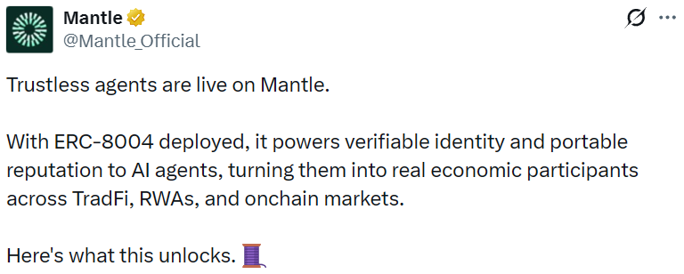 - Mantle 网络完成 ERC-8004 标准部署