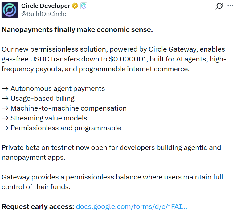- Circle 推出支付解决方案 Nanopayments 私测版