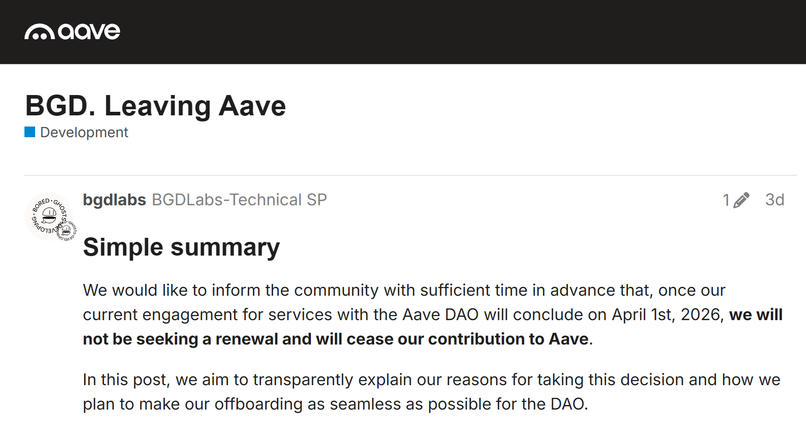 - Aave 核心技术贡献者 BGD Labs 将在 4 月 1 日之后停止参与 Aave DAO