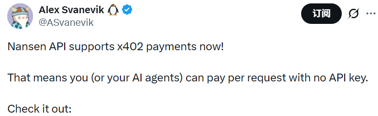 - Nansen API 已支持 x402 支付