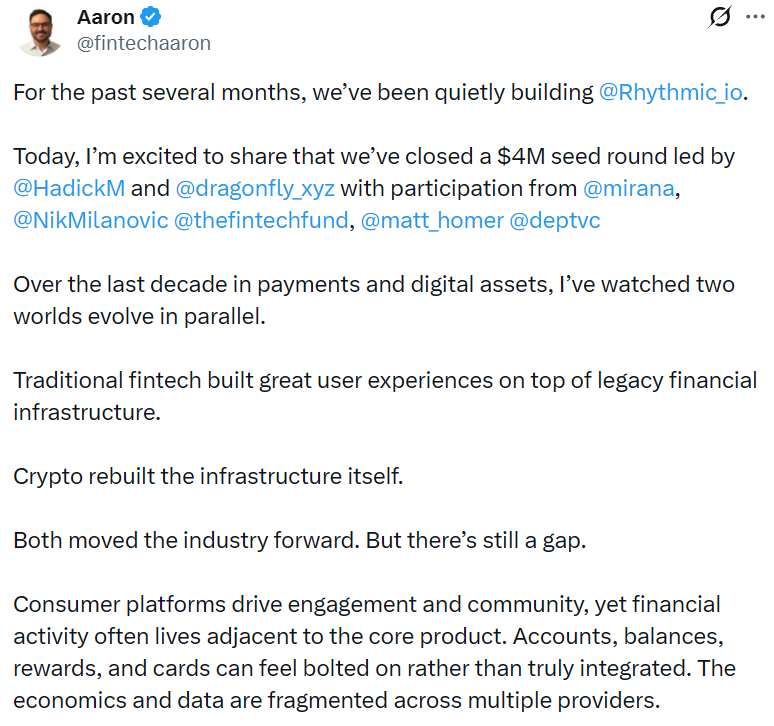 - 稳定币金融平台 Rhythmic 完成 400 万美元融资,Dragonfly 等领投