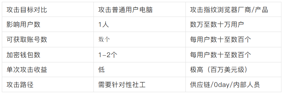指纹浏览器之所以成为高价值攻击目标,核心在于其攻击的” 杠杆效应”: