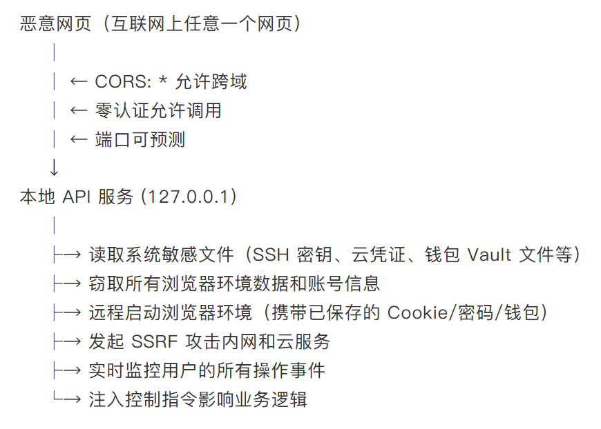 结合前述的本地 API 零认证暴露漏洞,攻击者通过一个恶意网页即可: