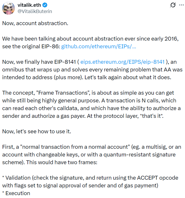 - Vitalik:以太坊账户抽象协议 EIP-8141 将在 Hegota 升级后发布