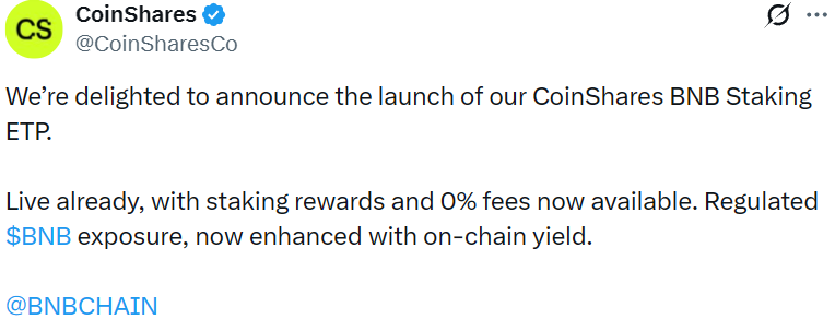 - CoinShares 推出 CoinShares BNB Staking ETP
