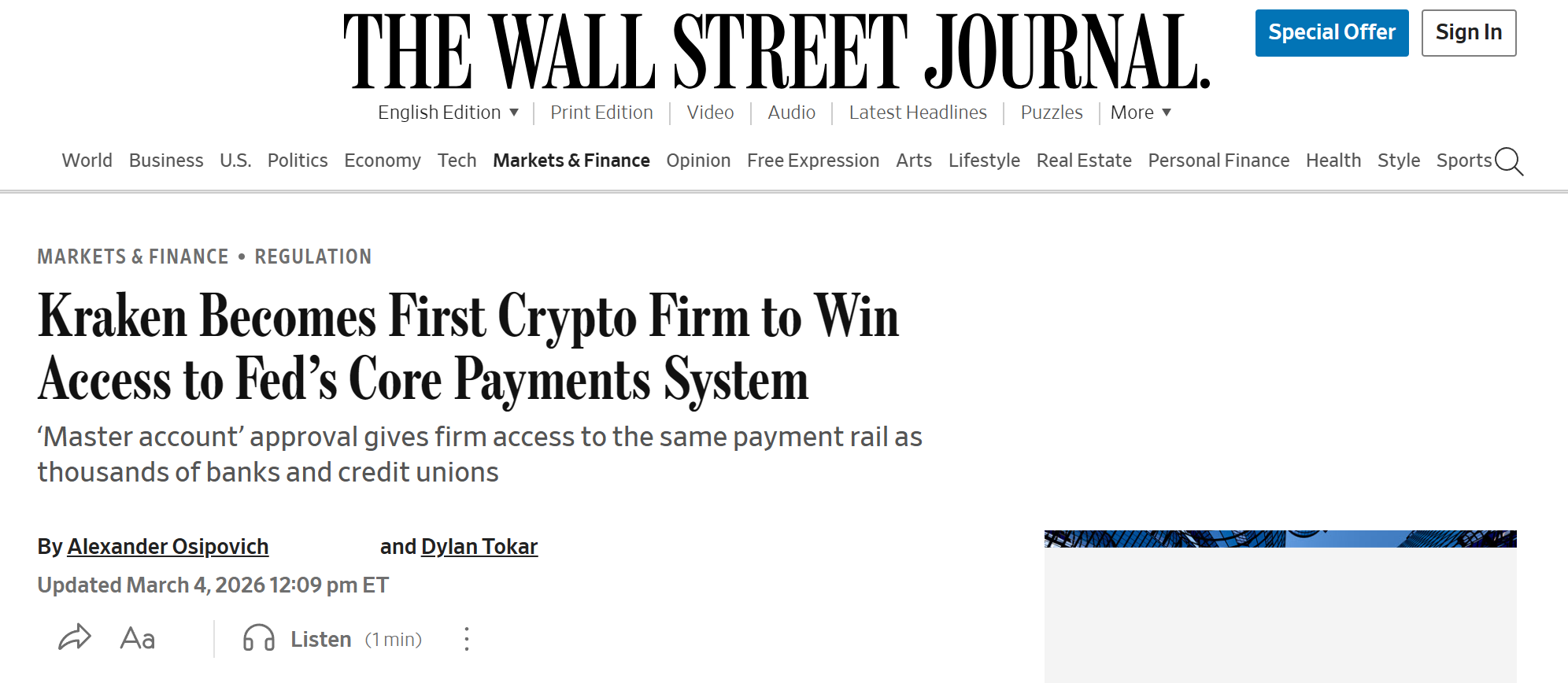 - Kraken 成为首家获得美联储核心支付系统访问权限的加密货币公司