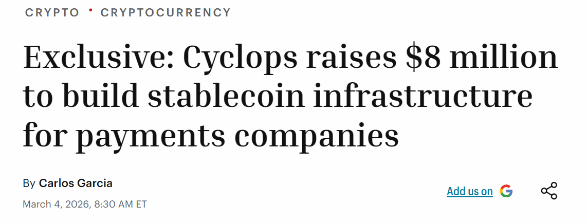 - 稳定币基础设施 Cyclops 完成 800 万美元融资,Castle Island Venture 等参投