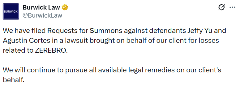 - Burwick Law 已向 ZEREBRO 联创提起诉讼