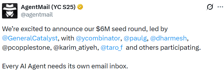 - AI 代理邮件服务平台 AgentMail 完成 600 万美元种子轮融资,General Catalyst 领投