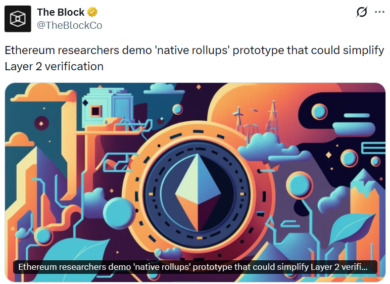 - 以太坊研究人员演示 Native Rollups 原型,简化二层验证过程