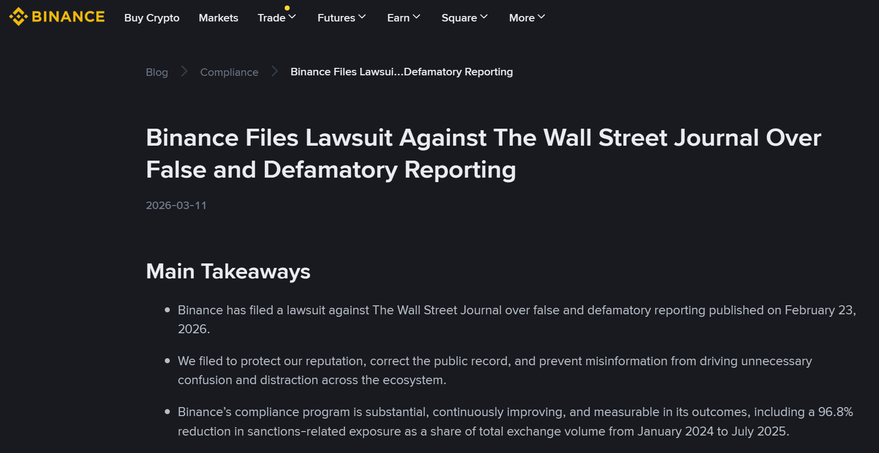 - 币安就 2 月 23 日伊朗制裁报道起诉华尔街日报诽谤