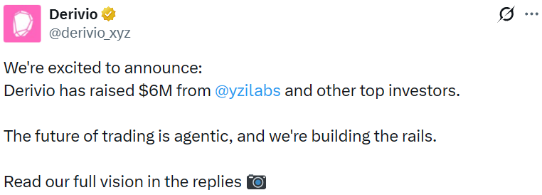 - AI 交易终端 Derivio 完成 600 万美元融资,YZi Labs 等参投