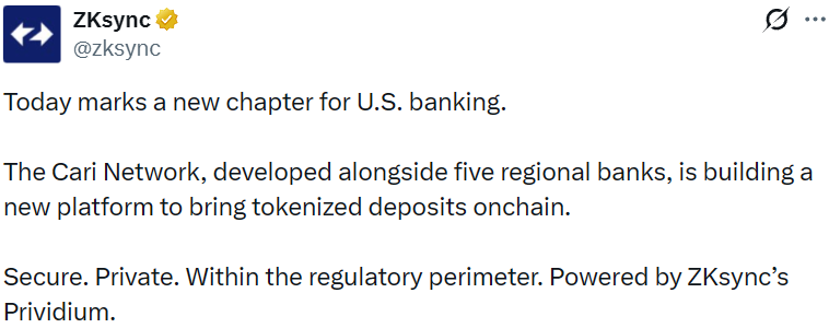 - ZKsync 联合五家美国区域银行开发代币化存款网络 Cari Network
