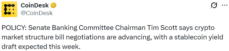 - 美国参议院银行委员会主席:稳定币收益草案预计本周推出