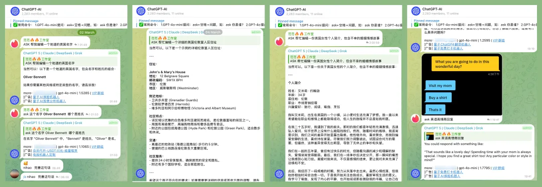 以名为量子科技的服务商公开社群为例,大量黑灰产从业者直接利用服务商的社群 Bot 生成欺诈素材。如上图,欺诈者通过这一服务,成功编造了一个位于英国伦敦的富有离异女士的身份,并在 AI 的指导下使用这一身份与潜在受害人进行跨语种对话。