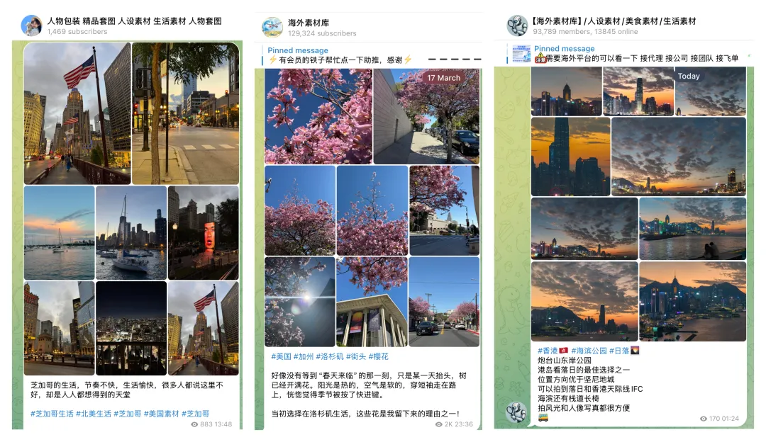 上图来自三个 Telegram 素材频道,请注意,这并非普通的风景照展示,而是专门提供给电诈从业者的电诈素材。这类照片往往还会搭配匹配的文案,方便欺诈者复制并发送至社交媒体。
