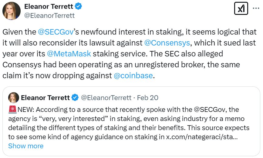 - 美 SEC 或将重新考虑针对 ConsenSys MetaMask 质押服务的诉讼