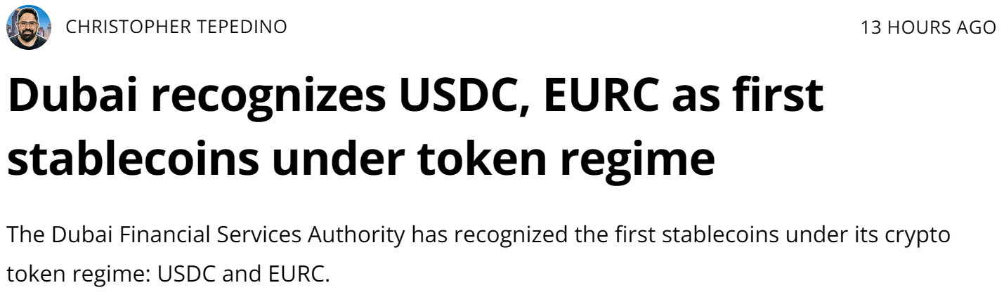 、迪拜金融服务管理局批准 USDC、EURC 为首批获认可稳定币