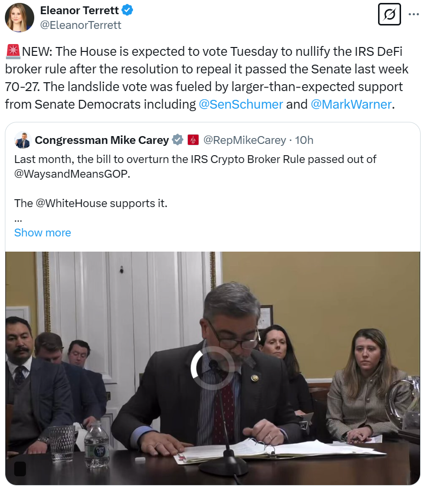- 美国众议院将投票废除 IRS DeFi 经纪人规则
